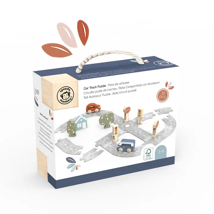 Our Car Track Puzzle is not only a source of entertainment but also a great way to promote problem-solving skills and hand-eye coordination in children. The durable wood material ensures long-lasting use, making it a perfect addition to your little one's playtime collection. Puzzle track is made of gray felt.