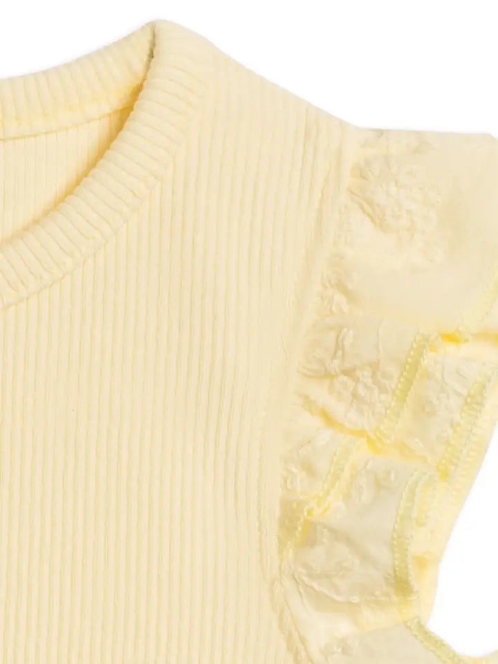 Sweet, stylish, and oh-so-comfortable, the Daphne Ribbed Tank with Eyelet Ruffle is a must-have for your little one’s warm-weather wardrobe. With its soft organic cotton ribbed fabric and charming double eyelet ruffle sleeves, this tank is designed to add a playful pop of style to any outfit. The ribbed neckline gives it a cozy yet polished feel, making it perfect for everything from family picnics to outdoor adventures. Pair it with the Lydia Ribbed Ruffle Shorts for a coordinated look that’s as cute as it is comfy.