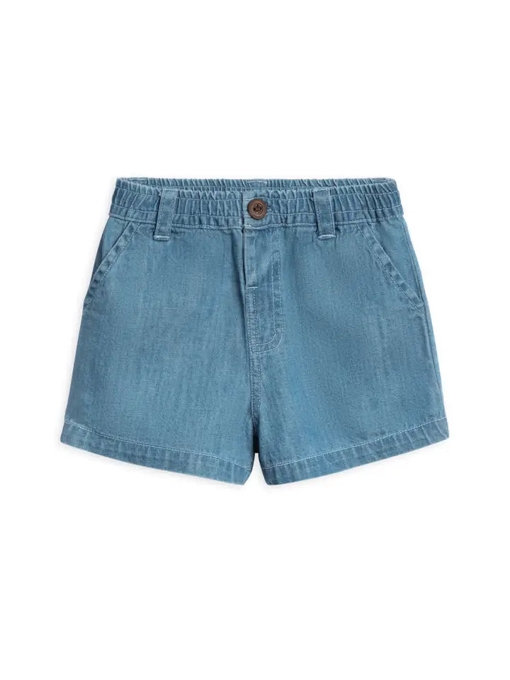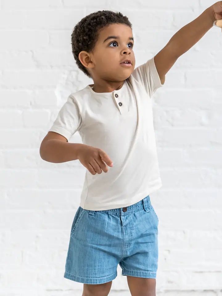 The Luke Chambray Short is the perfect balance of comfort and style for your little adventurer. With an elastic waistband for easy wear and belt loops for a polished look, these shorts are ready for any occasion. Slash front pockets and a back welt pocket provide plenty of space for little treasures, while the topstitch details add a touch of flair. Made from soft organic cotton chambray, these shorts are perfect for warm-weather outings, beach trips, or casual playdates.