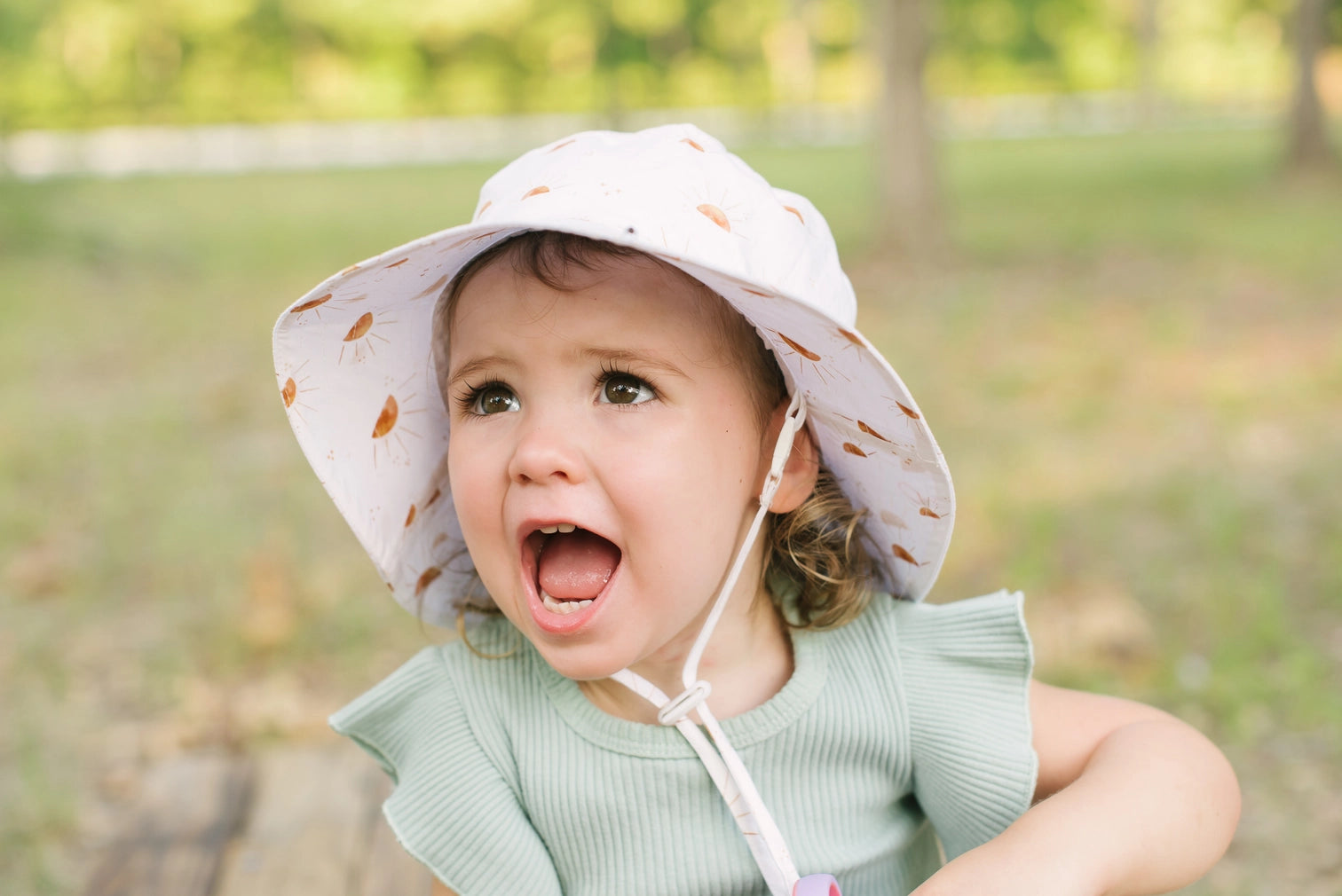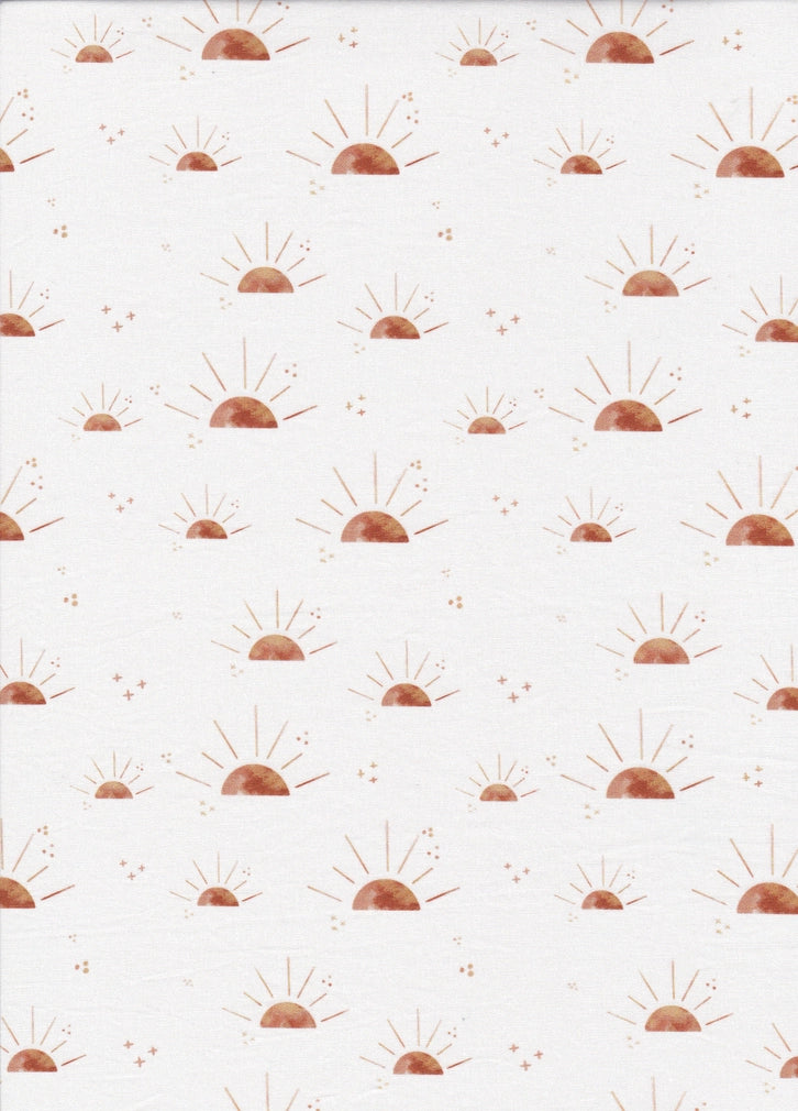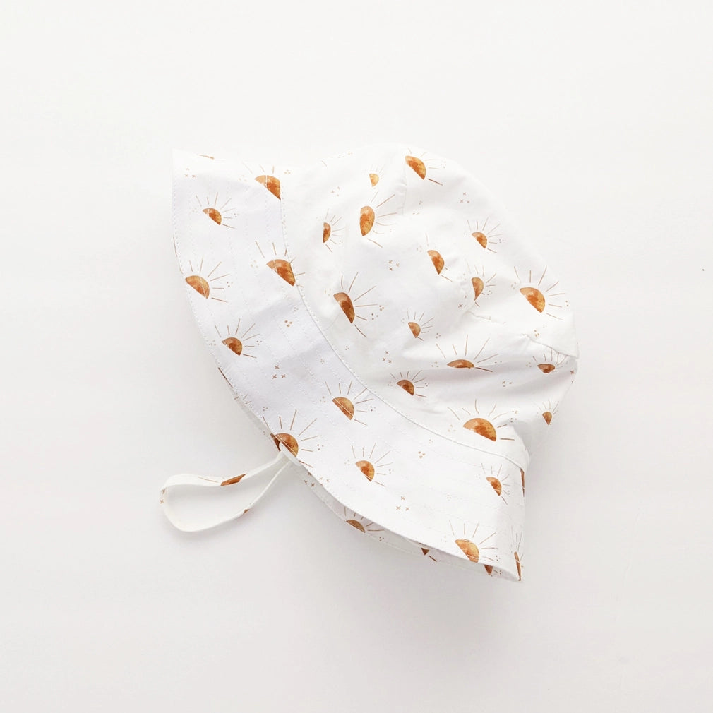 Perfect for the beach and everyday wear, this lightweight UPF 50+ bucket style sun hat is functional and cute. This one has a modern sunshine print in a warm brown on a white ground. The hat has an adjustable chinstrap to keep hat in place, with a breakaway clasp for safety.